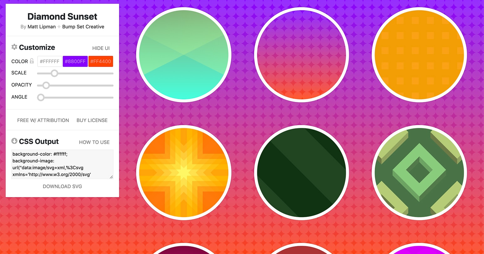 Hero Patternsも同様に、用意されたパターンの色や透明度をカスタマイズできます。コードをコピペして背景として利用可能。装飾のない SVG ファイルをダウンロードすることもできます。