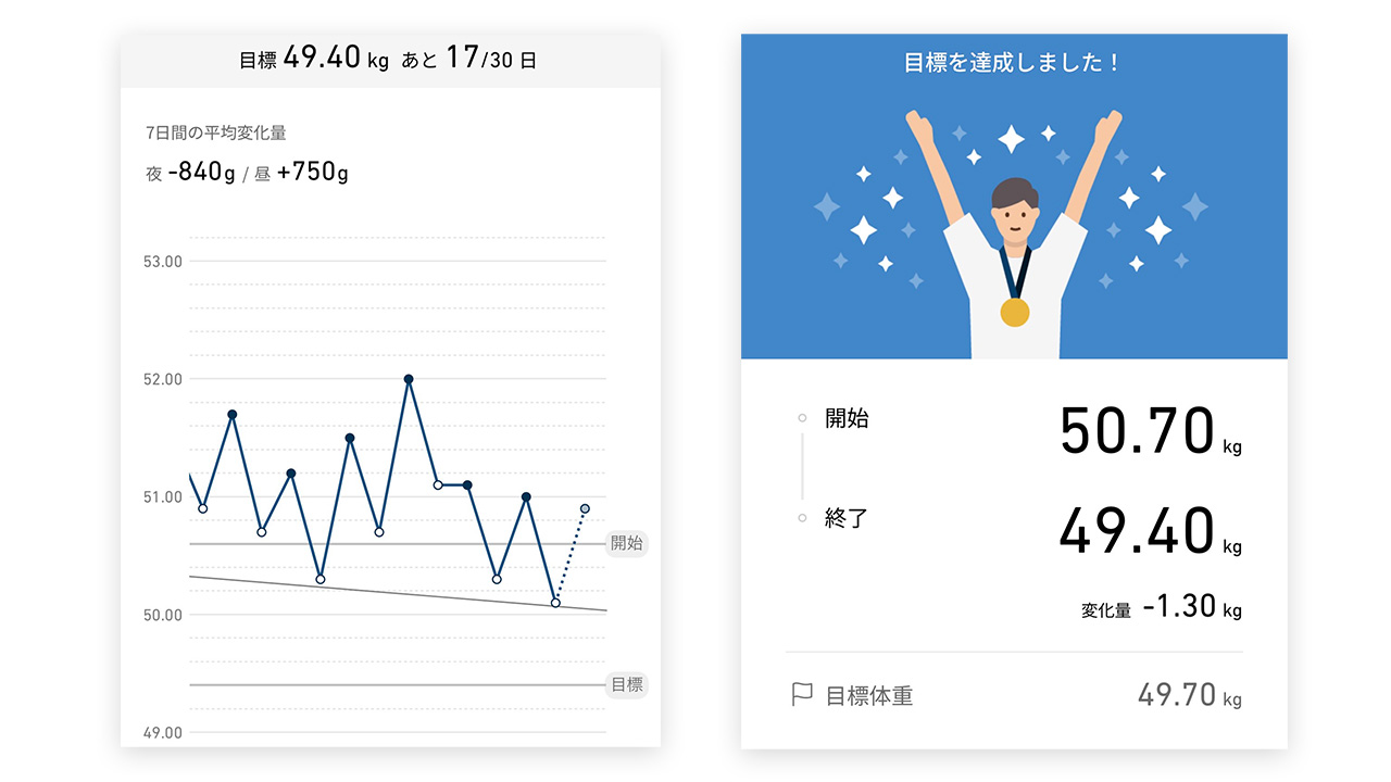アプリ対応の体重計を使い、Wi-Fi経由でアプリに転送して体重を記録できます。中でもアプリ内で提供されている「かんたん朝晩ダイエット」というプログラムは、朝と晩に体重を測って体重差を管理することで、痩せやすい生活習慣を身につけるというメソッドでおすすめ。