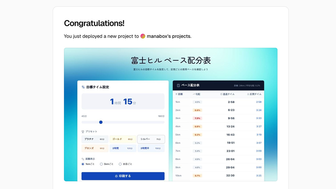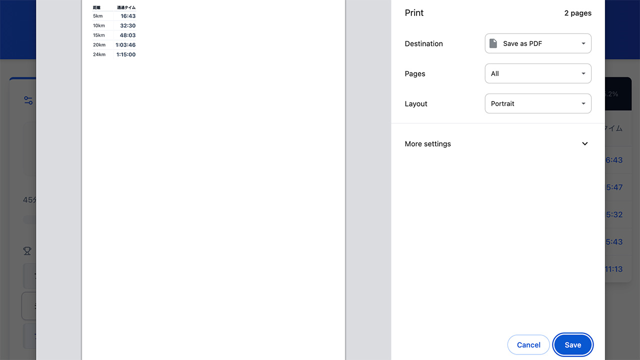 ペース配分表は印刷できるようにボタンを設置しています。印刷されるのは指定した距離と目安のタイムのみ。横幅約3.5cmにおさまる程度の細長い表で印刷できます。(印刷用のCSS、久々に書きました…。)