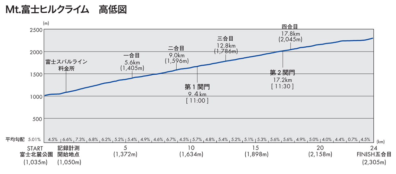 Mt.富士ヒルクライム(通称 富士ヒル)のゴールまでの目標タイム別ペース配分計算機です。富士ヒルは毎年たくさんのサイクリストが富士山五合目を目指して、全長約24km、標高差約1,255mのコースを駆け上がる、日本最大級のヒルクライムレースです。