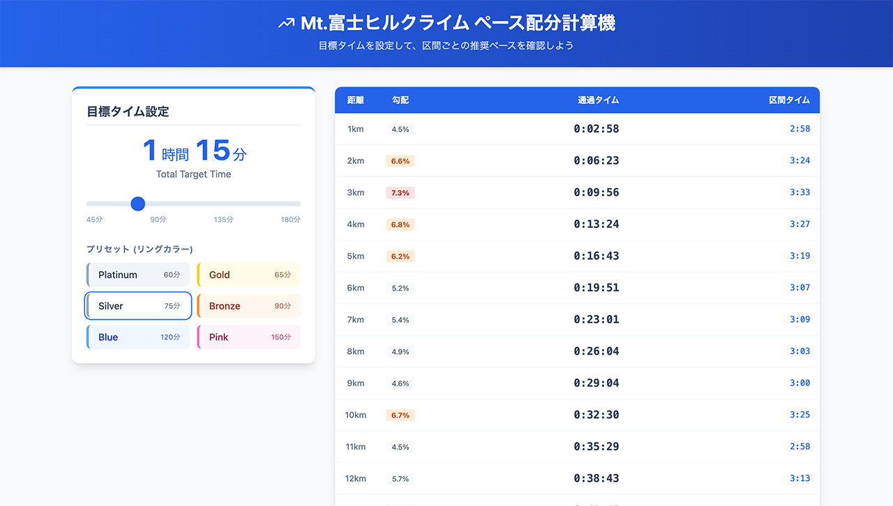 スライダーをドラッグしたり、プリセットにある目標リングやタイムをクリックすると、距離に応じた目標通過タイムを表示します。また、距離表示は1kmごと、5kmごと、◯合目ごとに選べます。