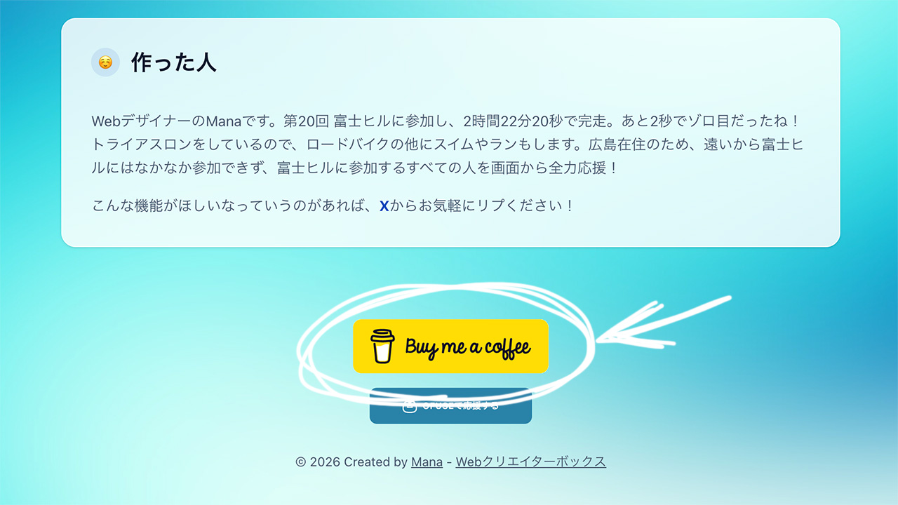 これから作っていくアプリにも、地味に費用がかかってきそうだなーでも広告はいやだしなーってところで、一つ実験をしてみました。海外のエンジニアやアーティストのサイトでよく見かけていた、Buy me a coffeeというサービスの導入です。