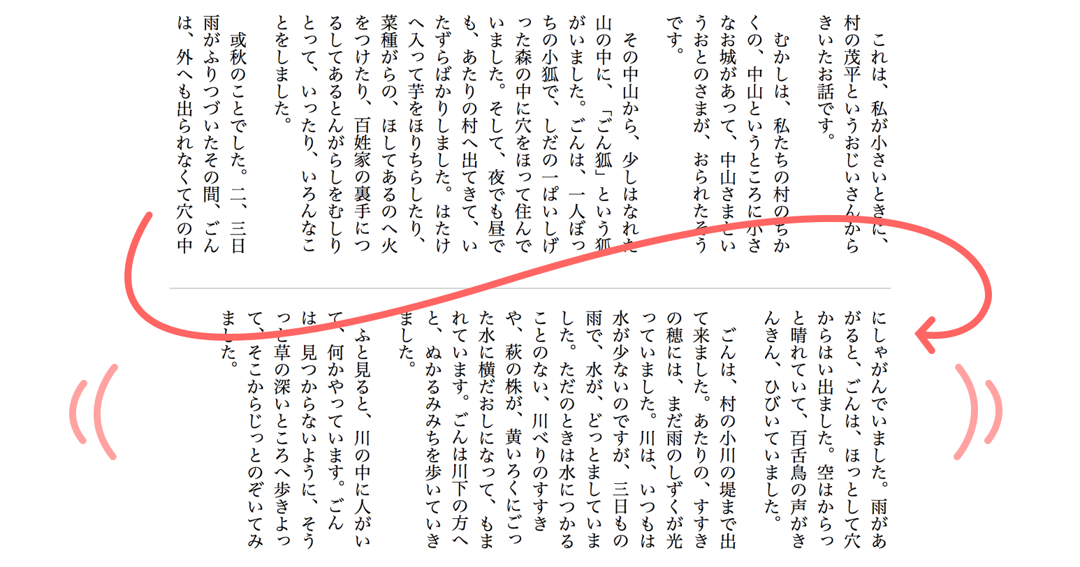 例えば wrapper というクラスのついた親要素に長い文章が入っている状態で、column-count: 2; を指定すると、縦書きの文章も二段にわけられます。