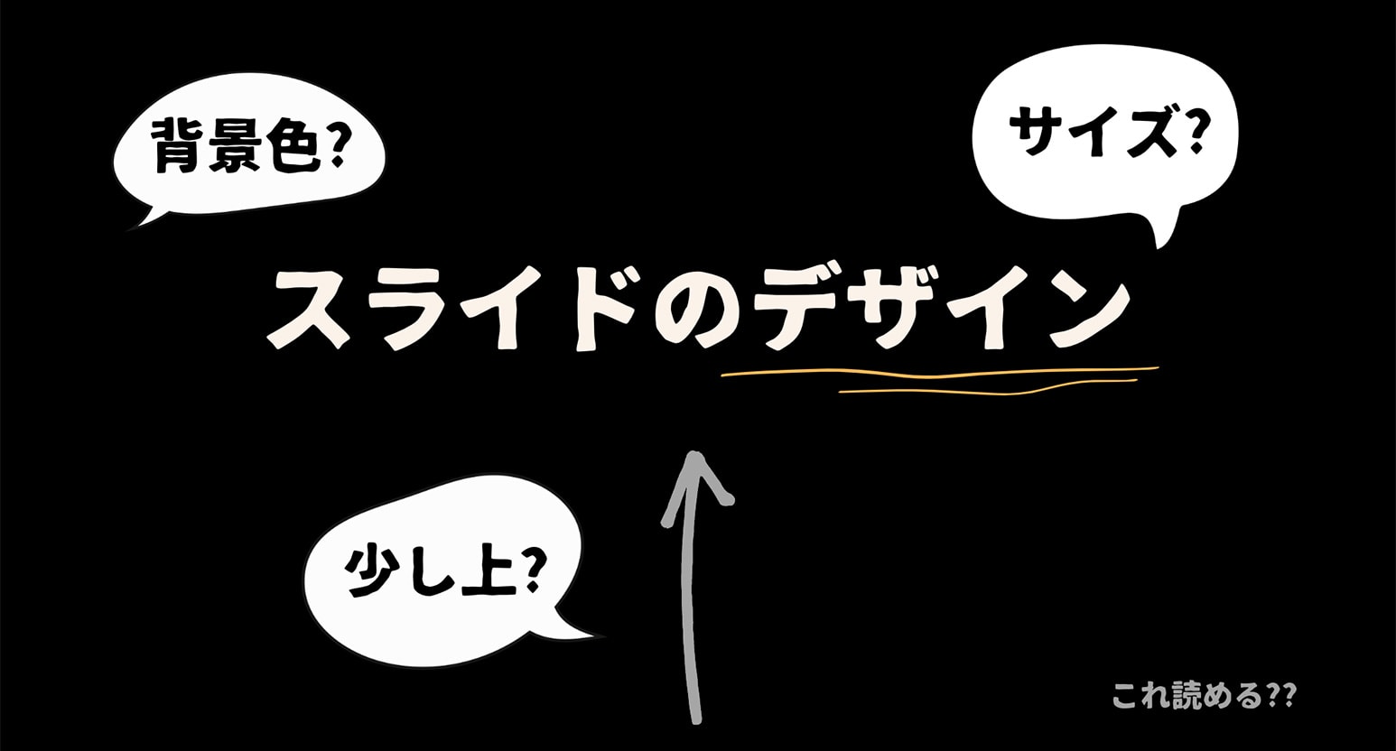 会場の場合、後方の席だとスライドの下の方が見えない可能性もあります。そこで、文字はど真ん中ではなく、わざと少し上に配置しています。スライドの下から 1/4 くらいは見えないことを前提にデザインするといいでしょう。
