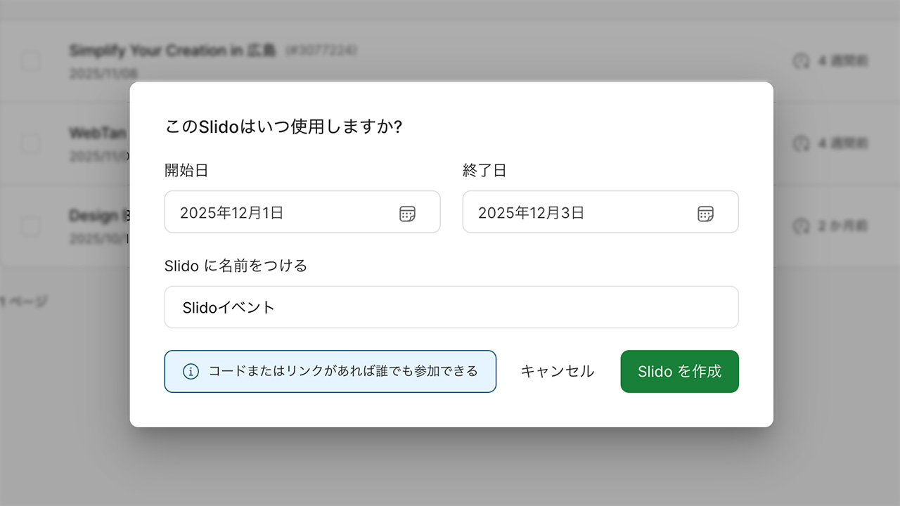 まずはアカウント登録をしてログインし、管理画面右上にある「Slidoを作成」ボタンをクリック。