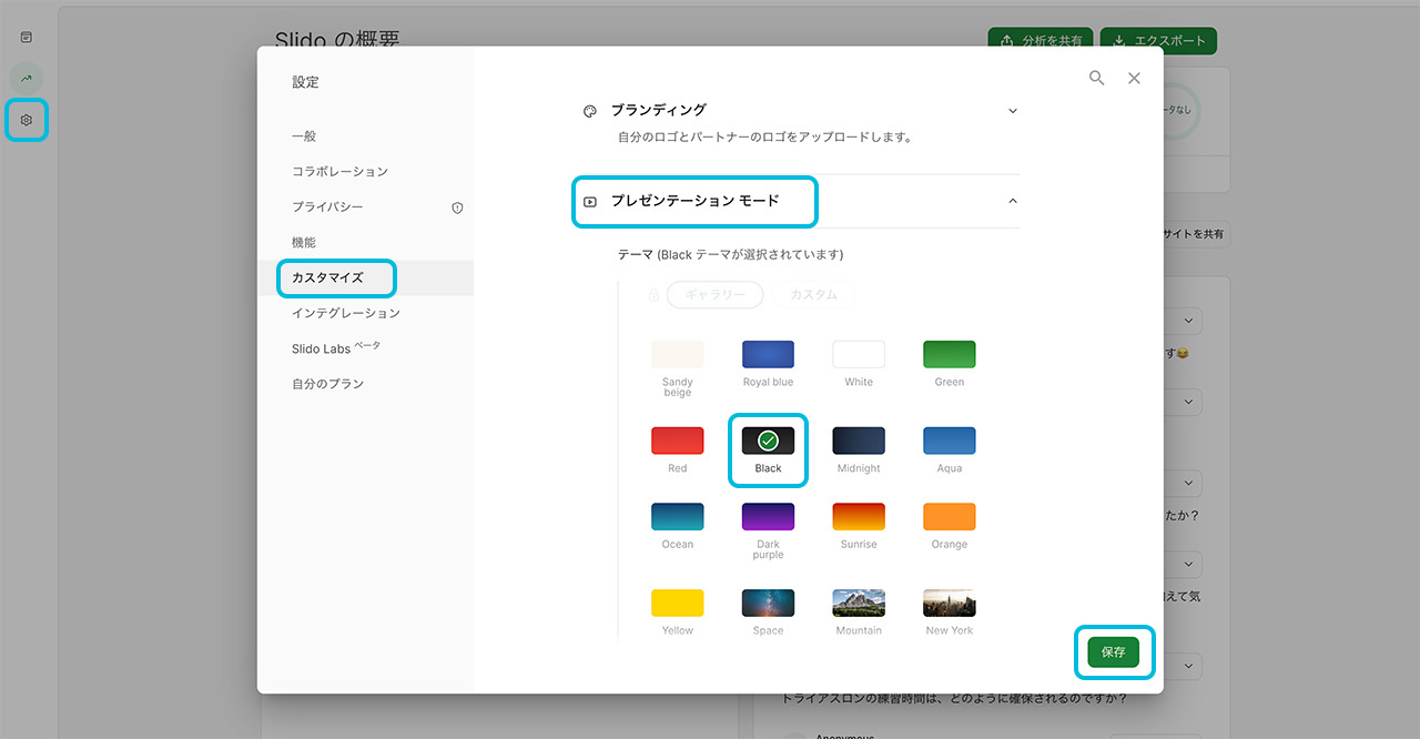 作成したSlidoを選択 → 左側の歯車アイコン⚙️ → カスタマイズ → プレゼンテーションモード から設定可能。私は基本的に背景色は黒に設定しています。黒を選ぶ理由としては、プロジェクターで投影する会場の場合、会場内は暗くなります。その状態でスクリーンが真っ白だと、眩しくて参加者の目が疲れてしまいます。