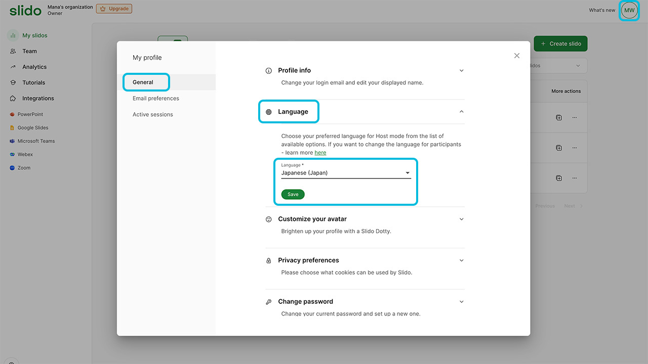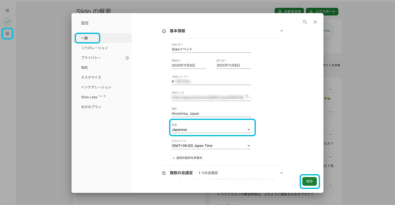 参加者用の画面では、作成したSlidoを選択 → 左側の歯車アイコン⚙️ → 一般 → 追加の設定を表示 → 言語 で「Japanese」を選択。