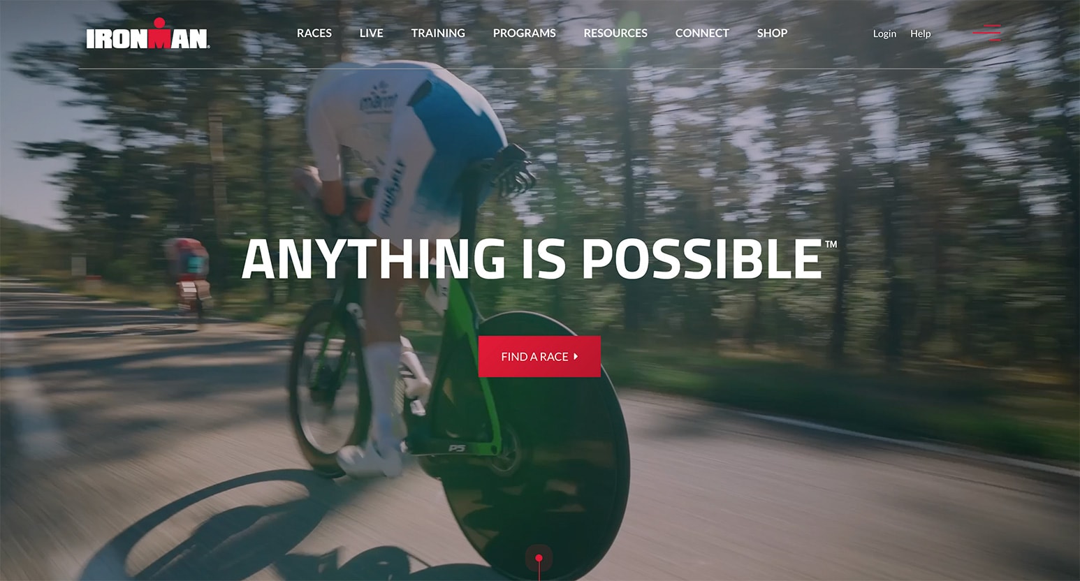 世界的に有名なIRONMANの Web サイトでは、ファーストビューで競技者だけでなく、イベント会場付近をドローン撮影した映像も交えて表示しています。