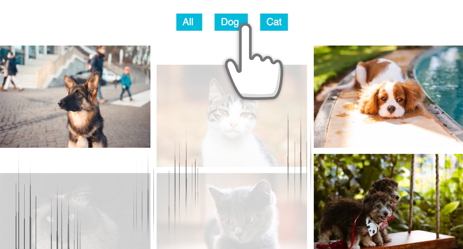 たくさんある商品画像やポートフォリオの作品一覧などを見せたいときに、カテゴリーごとに絞って表示できたら便利ですよね。Vue.js を使えば同じページのまま表示画像を変更できるので、管理も楽になりますよ。