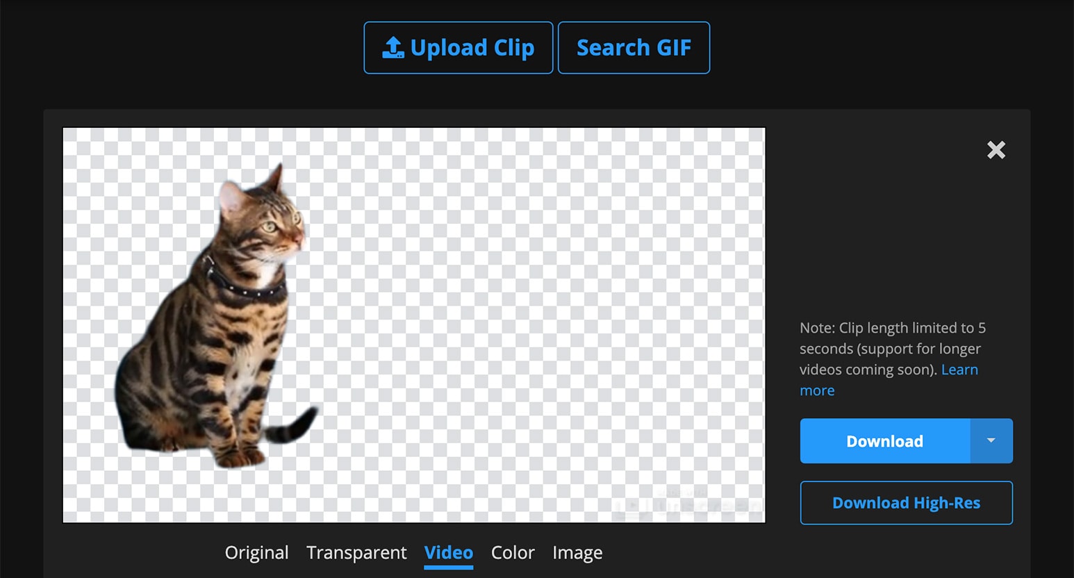 Unscreenは上記 remove.bg の動画版。mp4, .webm, .ogg, .gif の動画ファイルをドロップしてアップロード、または動画の URL を貼り付けると背景を切り抜いてくれます。こちらは動画なのでさすがに 5 秒とはいきませんが、それでも短時間で作業が完了しますよ。